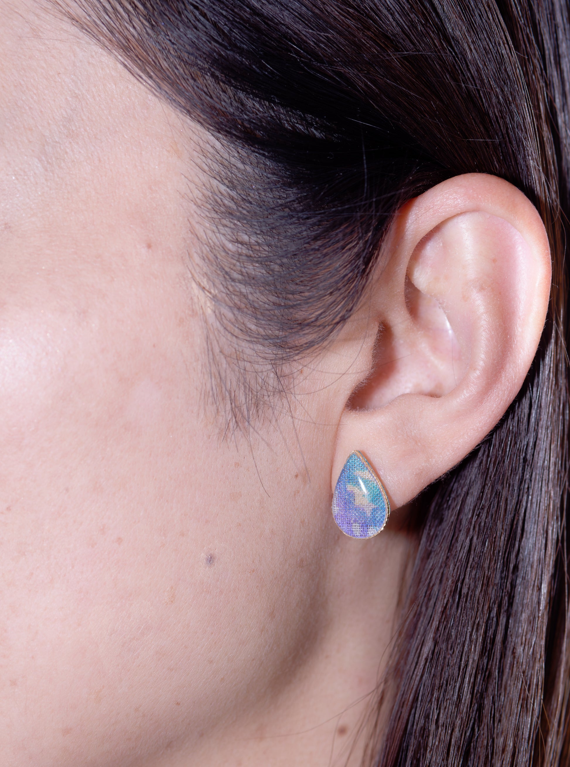 These earrings showcase a soft blue and purple floral design, handcrafted by dikka, using an authentic Bingata fabric traditionally used in Okinawan kimono. Each pair is carefully cut to highlight the natural flow and harmony of the textile’s pattern, preserving its original beauty. A small amount of salt (maasu) is embedded in each piece - a subtle gesture rooted in Okinawan culture, symbolizing protection and good luck. These earrings offer a gentle blend of cultural charm and timeless style, perfect for adding a meaningful touch to your everyday look.