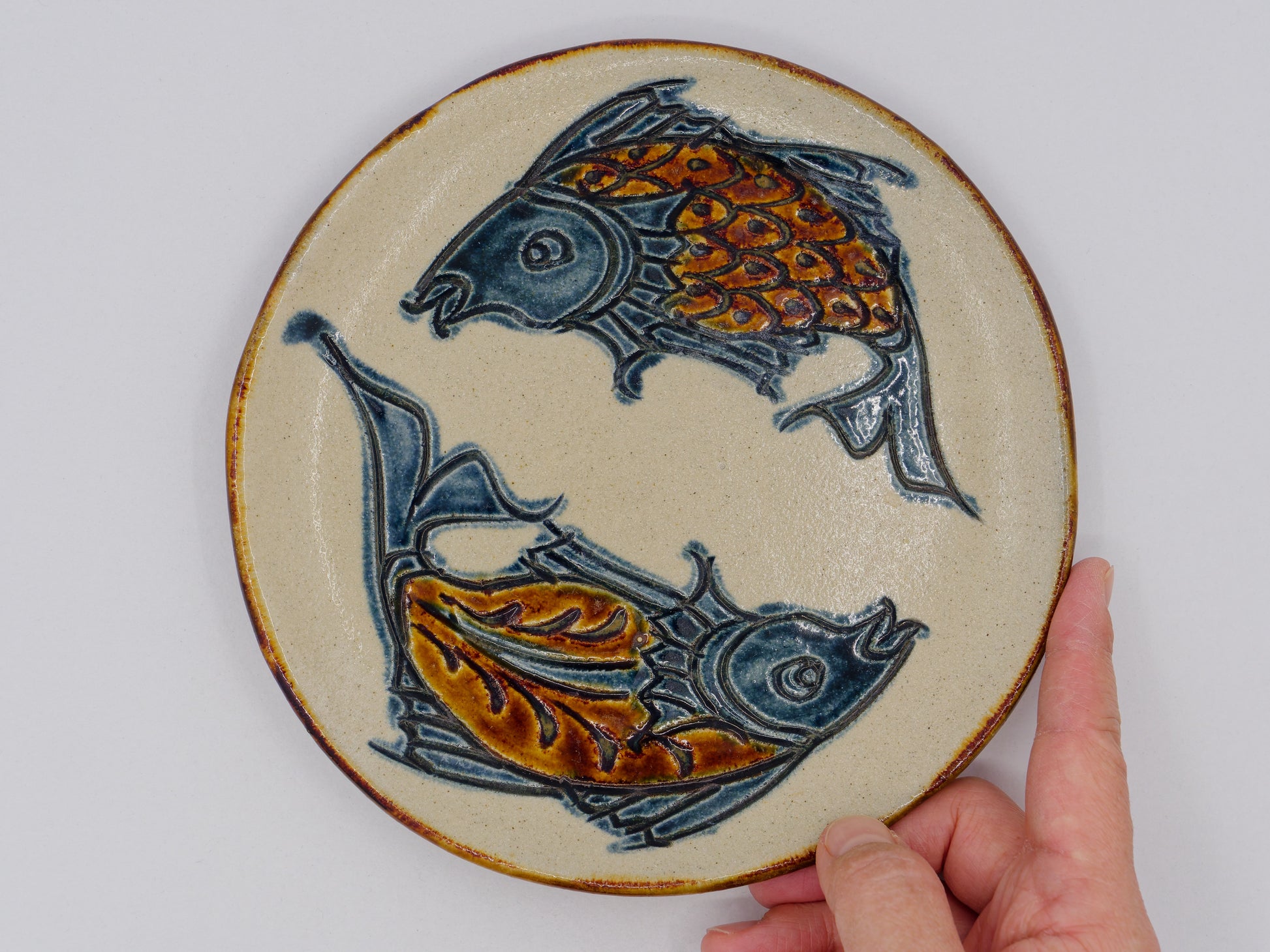 This plate features the traditional Gyomon (fish-scale) pattern, a motif deeply rooted in Okinawan Yachimun pottery. It reflects the Tsuboya-yaki style, originating from the historic pottery district of Tsuboya in Naha, where this design has long symbolized prosperity and the continuation of family lineage.